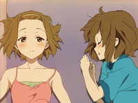 Yui and Ritsu play around at the beach until they were interupted by Mio. And her boobs. Thank you KyoAni...